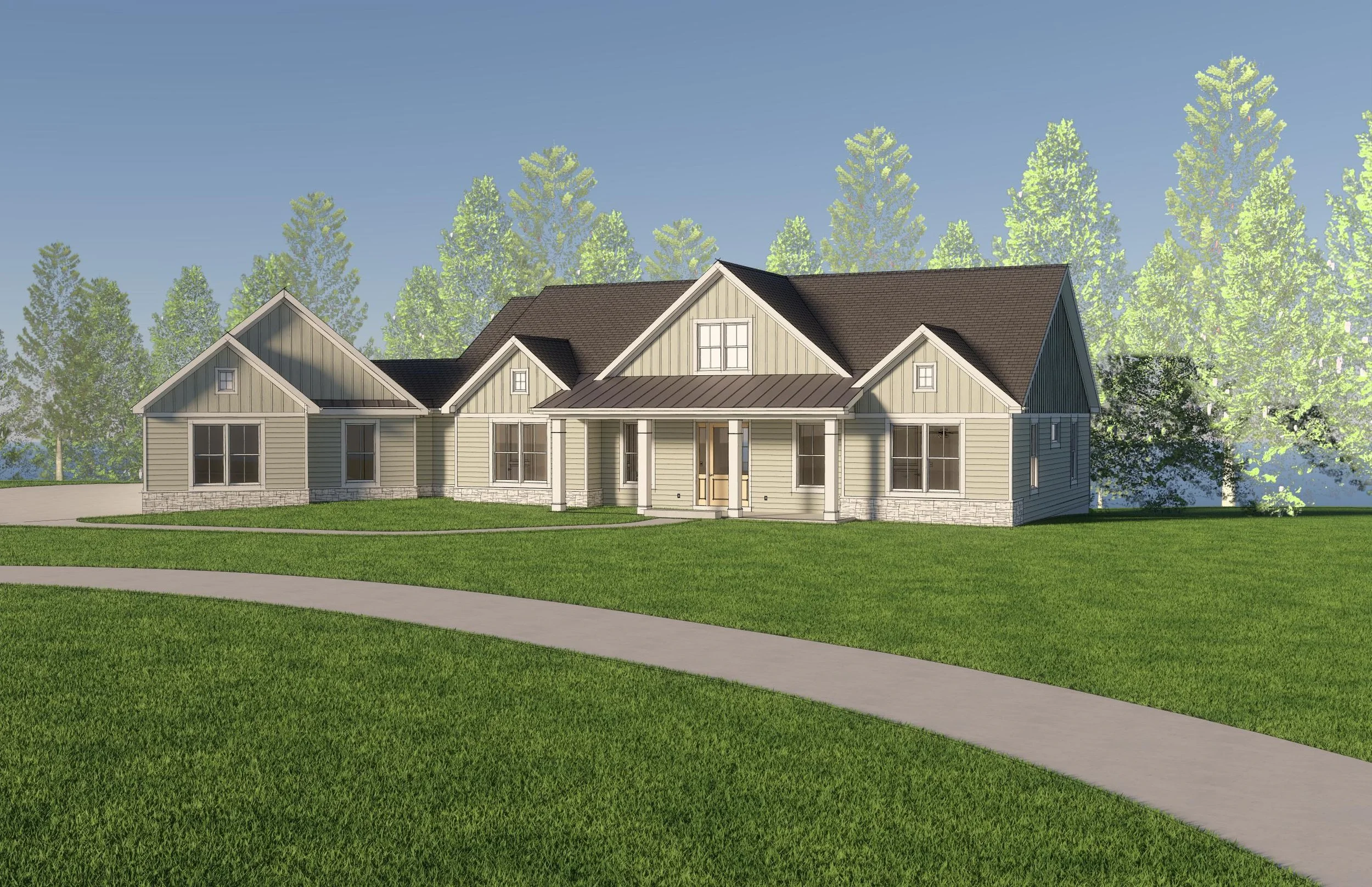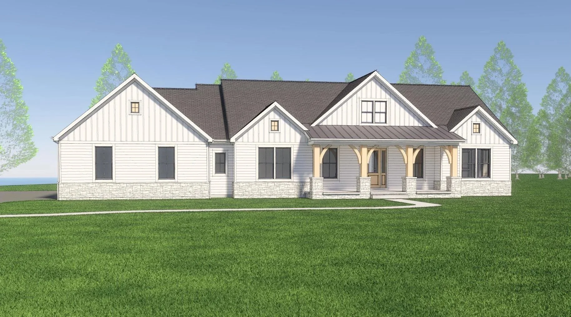 The Cheshire was designed as a "forever home," blending timeless farmhouse charm with the practical needs of aging in place. This ranch-style residence features over 2,400 square feet of main-level living space, an open interior, and seamless indoor-outdoor connections. With wider doorways and hallways for long-term accessibility, the home prioritizes comfort without sacrificing style. A spacious great room with a 12-foot ceiling and wood beams, along with a wall of sliding glass doors leading to a covered porch, makes this a home built for every chapter to come.